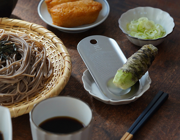 0.3ミリという低めの刃付けで、ワサビをやさしく回すように擦りつけると良いです。練りおろす感覚でおろすことで、鮮烈な辛みと甘み、香りを引き出せる刃になっています。ワサビが美味しいだけで、お刺身がグッと美味しく感じられるもの。
