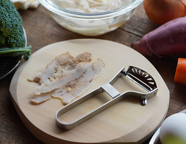刃は緩やかにカーブしており、にんじん、大根、ジャガイモなど、あらゆる食材の表面にフィットします。カーブを当てるのには少し慣れが必要ですが、一度にむく面積が大きいので、太めの大根などもスピーディーにむくことができます。