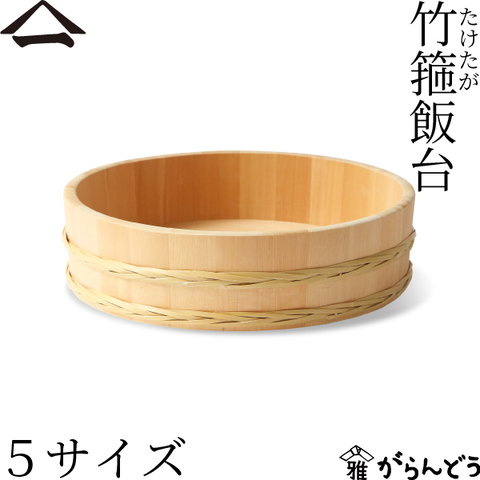 山一の竹箍飯台は昔からの技法で、桶やお櫃を固定する竹箍で作られています。作り手自らの目で選んだ竹を使い、手間がかかる「ぐい編み」という丈夫な組み箍でしっかりと締められています。