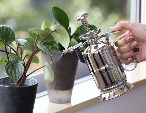 こちらの霧吹きは、タンク内に空気を入れて使う加圧式のもの。レバーを引いたままにすると水が出つづけ、スプレー缶のようにお使いいただけます。何度もトリガーを引かなくても良いので、手が疲れないということに加え、霧吹きを使うのが楽しいと感じるように。
