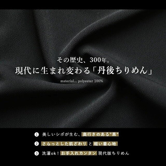 ちりめんならではの、表情豊かな生地、奥行きのある黒色、そして、湿気の多い日本の夏にぴったりなさらっとした肌あたりと快適な着心地をお楽しみください。