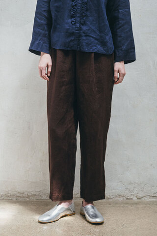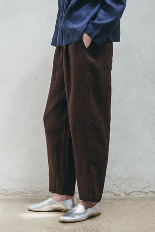 「シンプルなパンツは、股上たっぷりでウエストゴムなので、リラックス感があります。新色のチョコレートは、いろんな色に合わせやすく、濃色ですが柔らかい印象もありつつコーディネートに秋らしさが出て素敵。手を出し入れしやすいサイドポケット、ヒップのパッチポケットもあり、ちょっと携帯やハンカチを入れておくときにも便利です」