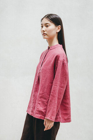 「立ち上がった襟とちいさなボタンの組み合わせが、他にはなかなかないデザインでお気に入りです。大きめのパッチポケットも便利なうえに、アクセントになってかわいい。シンプルなボトムスとあわせるだけでサマになります」
