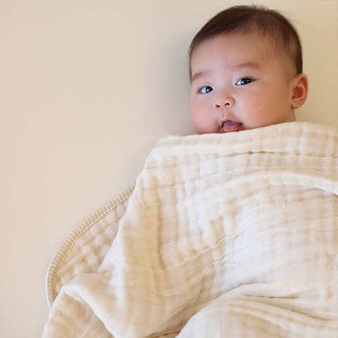 オーガニックコットン100%のふんわりガーゼをたっぷり6枚重ねたガーゼケットは使い込むほどにふわふわに。