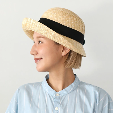 巻き上がったブリムのエッジと丸いクラウンが特徴で、麦わらならではの優しいカーブを描くエレガントさが魅力。