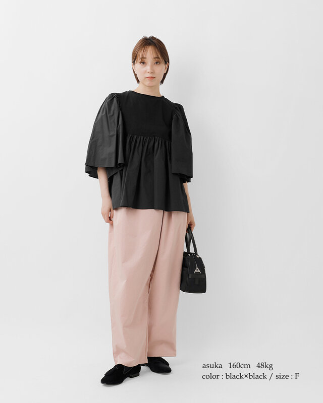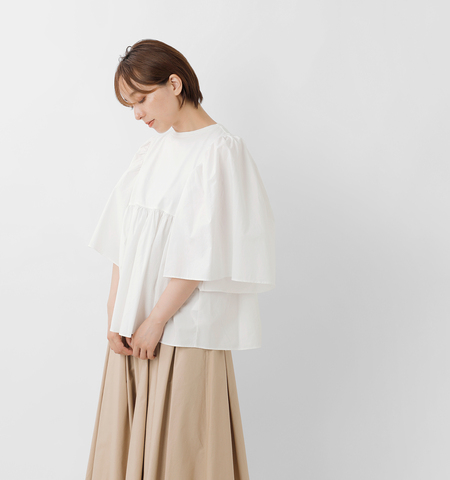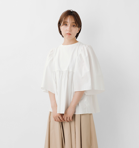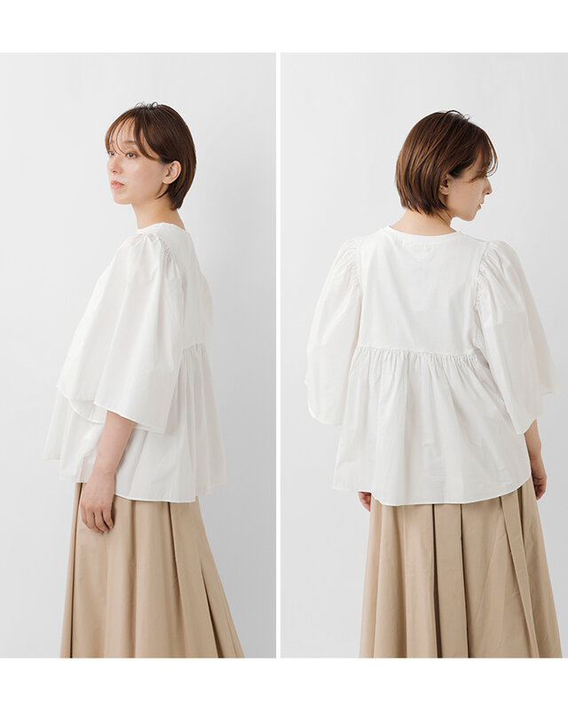 ゆったりとしたフレアシルエットと、袖のボリューム感が女性らしく、シンプルながらも存在感のある1枚。