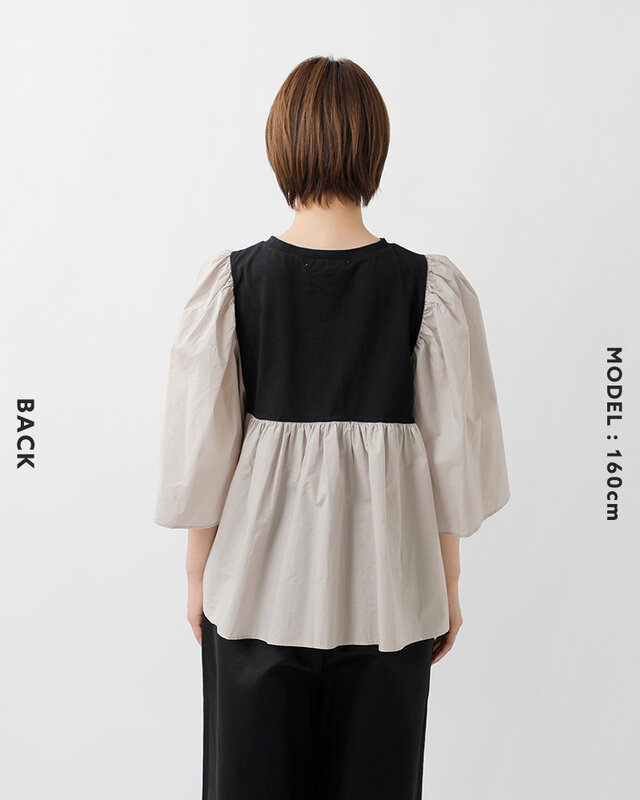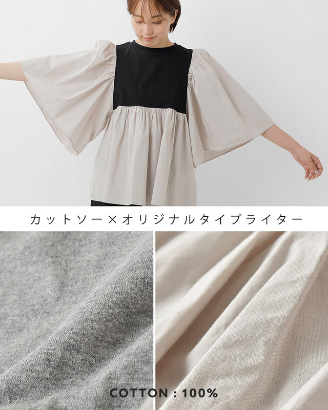 上身頃には柔らかく滑らかな肌触りの中肉カットソー、袖と切り替え下にはシルキーな質感のオリジナルタイプライター生地を使用した、異素材コンビのデザイン。