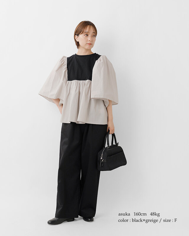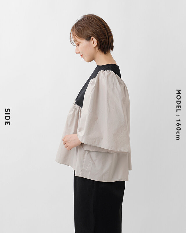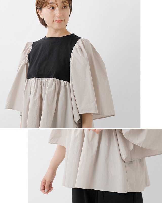 上身頃には柔らかく滑らかな肌触りの中肉カットソー、袖と切り替え下にはシルキーな質感のオリジナルタイプライター生地を使用した、異素材コンビのデザイン。ゆったりとしたフレアシルエットと、袖のボリューム感が女性らしく、シンプルながらも存在感のある1枚に仕上がっています。ボートネックの首元が顔まわりをすっきりと見せ、華やかさと抜け感を両立。カジュアルからきれいめまで幅広いスタイリングに活躍します。製品洗い加工により、ナチュラルでこなれた風合いをプラス。デイリーに使いたくなる心地よさです。
