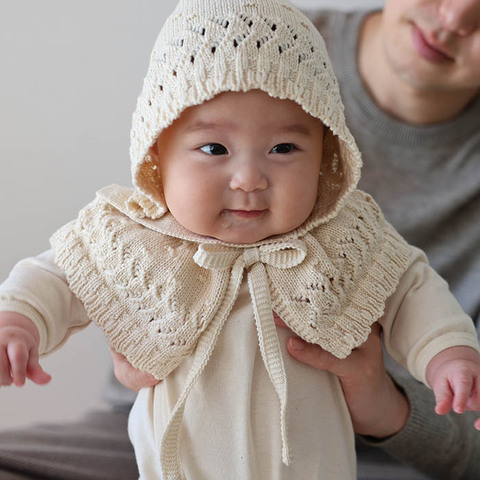 ぽこぽこしたポップコーンの編み模様が特徴のマント、裏地は同じくオーガニックコットンをハイゲージに編んだ編地を使用しているので今の時期はあたたかで快適にお過ごしいただけます。