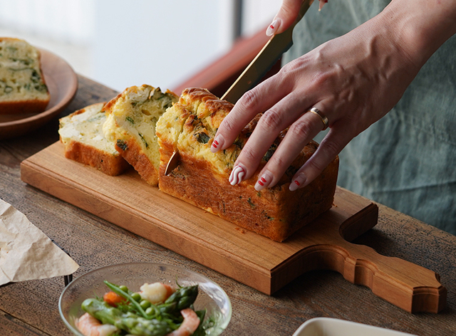 ブレッドナイフには、密度が高く、堅くて頑丈な山桜のカッティングボードがピッタリ。ギザギザ刃も安心してお使いいただけます。