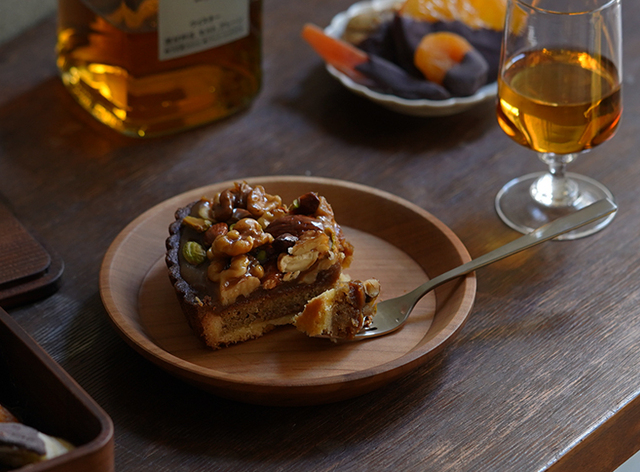 山桜の滑らかな木肌の表情を活かしながら表面を保護するオイル仕上げにより、シミや汚れがつきにくくなっています。深みのある色合いに盛り付けた料理やお菓子がよく映え、おうちカフェも楽しむことができます。
