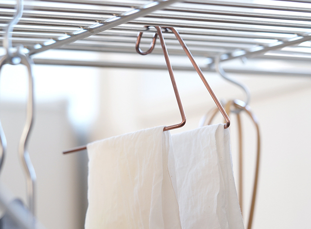 複数枚を同時に使いたい方におすすめの、正方形の和晒を2つ折りにして干せる2枚掛けハンガーです。ステンレス製なので、水まわりでも安心です。