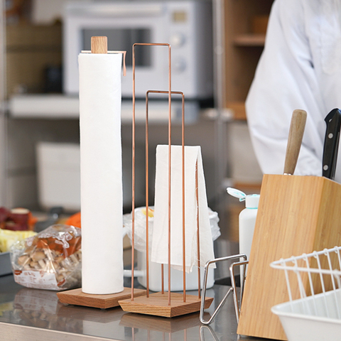 正方形(約350×350mm)の和晒の形にフィットする3枚掛けのスタンド。安定感のある木製の土台に、水に強く錆びにくいステンレス製のフレームを取りつけました。和晒ロールスタンド(別売)と並べてお使いいただけます。