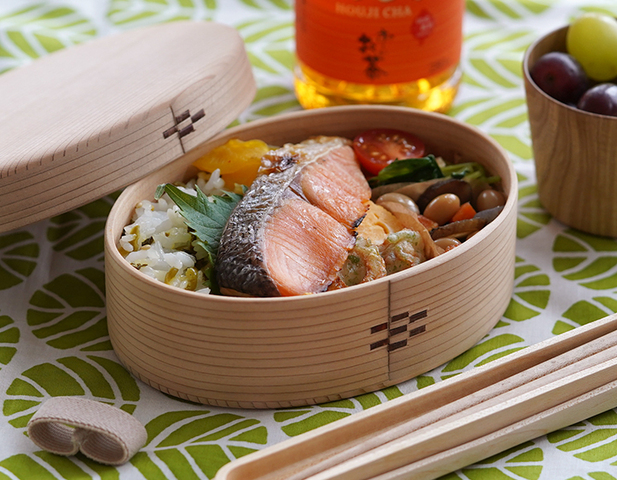 工芸品としての美しさと暮らしの道具としての使いやすさが両立した美しい佇まい。暮らしの中の道具、曲げわっぱ弁当箱の、ともに変化していく様も楽しんでお使いください。