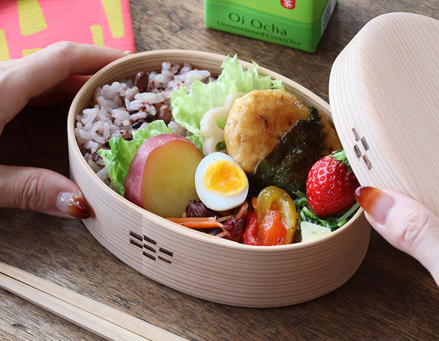 樹齢150年以上の天然杉を使用し、厚みを持たせた曲げわっぱ弁当箱。高樹齢杉の白く美しい風合いのお弁当箱が、美味しそうにご飯やおかずを魅せてくれます。