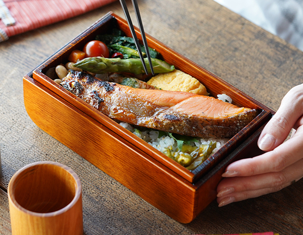 適度な吸湿作用があるため、ご飯がべとつかず、お弁当を食べたときにかすかに感じる木の香も楽しむことができ、檜材と漆の持つ天然の抗菌作用がごはんやおかずを新鮮に保ってくれます。