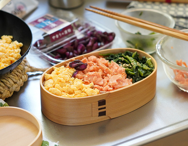 曲げわっぱのお弁当箱は、ごはんやおかずが傷みにくく、冷えても美味しくいただけます。