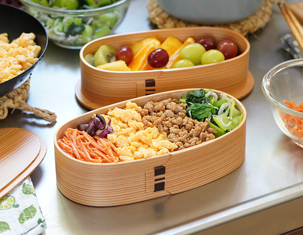 軽くて持ち運びしやすい曲げわっぱ。入子弁当箱は食べ終わると重ねて収納できてコンパクトに。