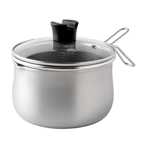 また、底に丸みのあるコロンとしたフォルムと深さもこちらの強みです。この2つの特徴により効率良く対流する為、火の通りが早く調理の時短を叶えます。他にも、コンパクトで深さがあるから揚げ油は飛び散りにくいし、そもそも少ない油でOK。卵や野菜を茹でる時なら、水の量も少なめで済みます。