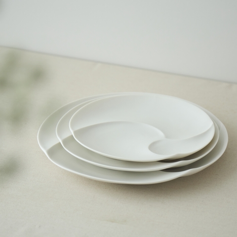 そんな気の利いた仕切り皿を作るのは、愛知県で作陶を行う加藤 好康さんです。直線的な仕切り皿が多い中、「やわらかいイメージの仕切り皿を作りたい」というつくり手の思いからこちらは生まれました。せっかくの使い勝手の良いお皿ですので、様々なシーンにちょうどいいサイズ展開をご用意しています。