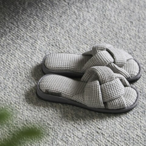 タオルやシーツなどによく使われるワッフル素材を採用したスリッパです。ワッフル素材は洋菓子のワッフルのように凸凹がある生地のことです。こちらはつくり手オリジナルのワッフル素材で、柔らかくてさらっとした肌ざわり。吸水性が高いのでお風呂あがりや帰宅した直後など、汗をかいてもすぐに吸い取ってくれます。