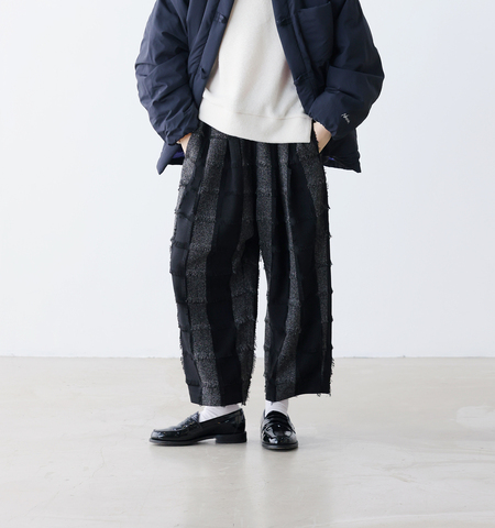 特徴的なフリンジ素材を使用したパンツアイテム。ハウンドトゥース柄を基調としたフリンジ素材と大柄のストライプベースのフリンジ素材の2種を使用しました。