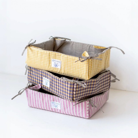 人気の猫のプフと同じく、イエローチェック、ピンクストライプ、パープルチェックの3種類です。