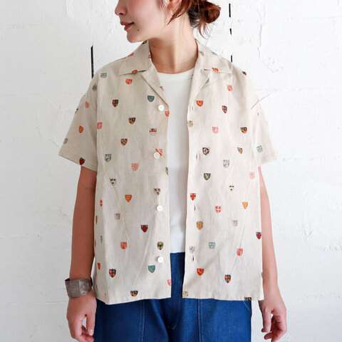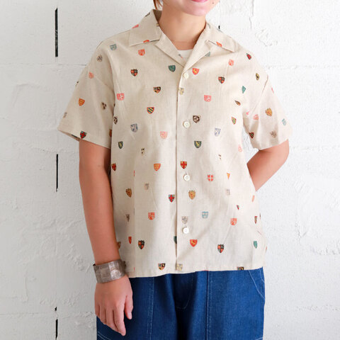 様々な紋章をプリントした拘りのコットンリネン生地を使用したオープンカラーシャツ。