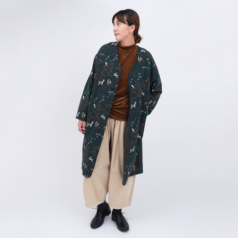 生地には「starry forest」と名付けられたテキスタイルを使用。しんと澄んだ冬の夜空の下に広がる原生の森が、マーブルならではの大らかな刺繍で描かれています。