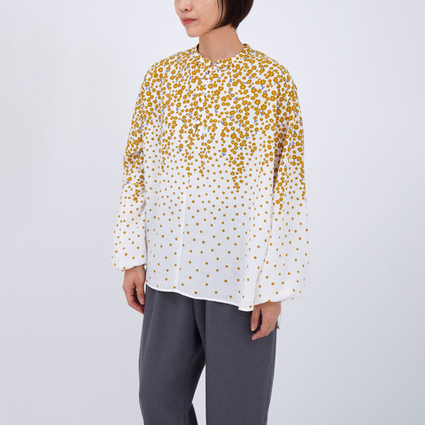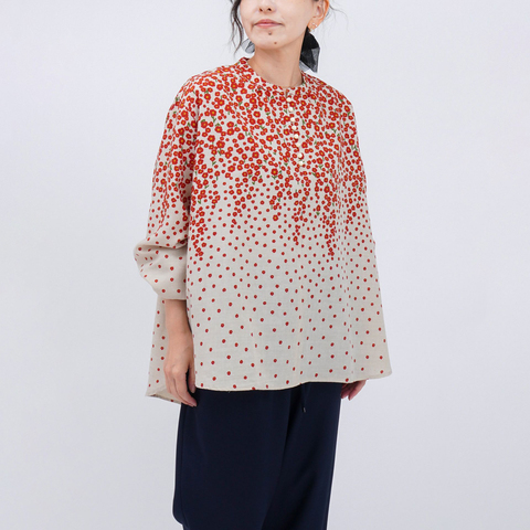 シンプルなボトムスと合わせるだけで、柄とシルエットが主役になり、コーディネートが自然と華やぎます。前を開けて軽い羽織りとして取り入れれば、季節の変わり目にも活躍します。