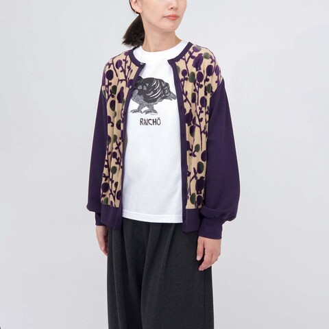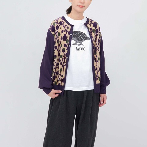 前身頃にライチョウと木の実のベロアジャカードをあしらったカーディガン。程よくゆったりとしたシルエットで、無地の前立てもポイントです。