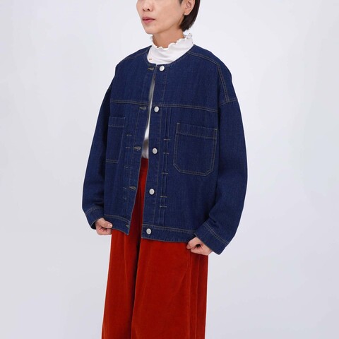 首もとをすっきり見せるノーカラーのデニムジャケット。