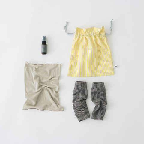 レモンの巾着にはグレー色の腹巻とレッグウォーマー、そしてライトグレーの巾着にはベージュの腹巻とレッグウォーマー。そこにそれぞれ入眠スイッチミストも入り、くらすことのオリジナルの巾着でお届けします。