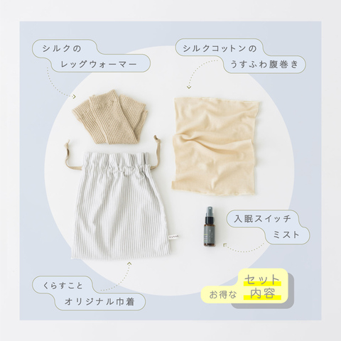 そんな質の高い眠りの時間をサポートしてくれる3つのアイテム「シルクコットンのうすふわ腹巻」「シルクのレッグウォーマー」「入眠スイッチミスト」に、くらすことオリジナルの巾着(1,500円相当)がついてくるお得なセットができました!