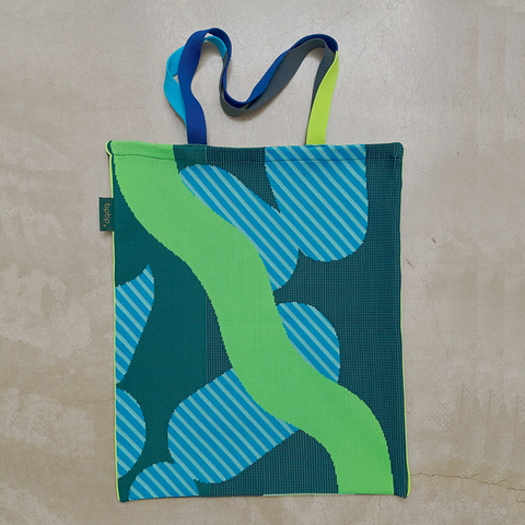 テキスタイルデザイナー 鈴木マサルさんが表現する色柄が再現されたニットトートバッグ。