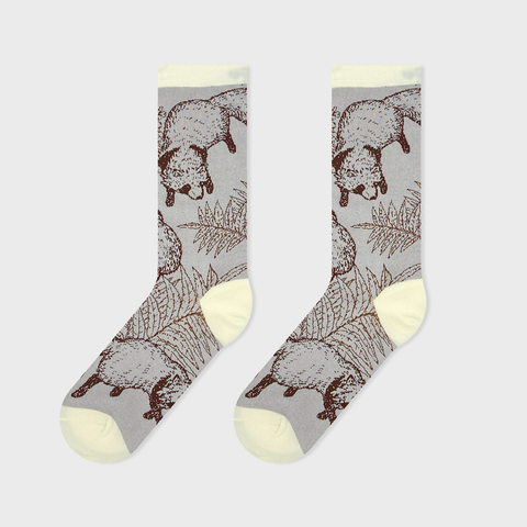 ブラウンのワントーンで描かれたタヌキが再現されたソックス