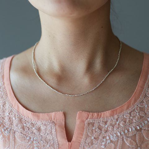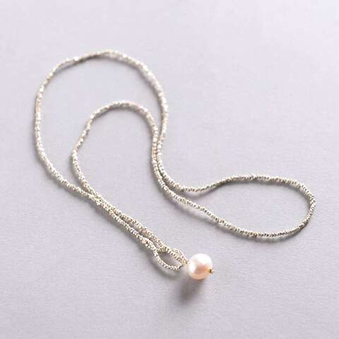 パールを後ろにすればシンプルながらもシルバービーズの存在感が際立つネックレスに。