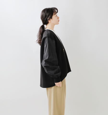 胸元が大きな開きのVネックで、センターにあしらわれたゴールドのジップがラグジュアリーなアクセントになっています。肘部分に入れた深めのタックでボリュームを出した袖がポイントです。