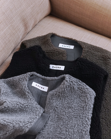 厚手のトップスにも羽織れるゆとりあるアームホールや、前開きで留め具のない抜け感のあるディテールが、自由なレイヤードスタイルを実現。裏地はサラリとしたウール100%素材で、着心地もスムーズ。
