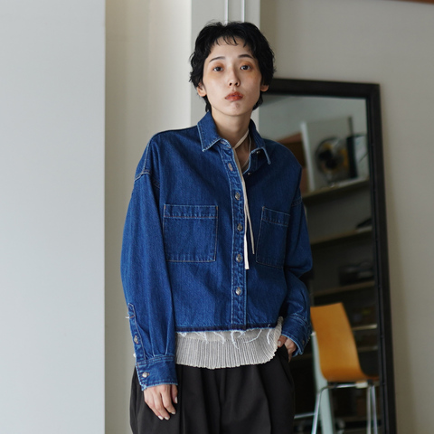 こなれた印象を演出するオーバーシルエットに、トレンド感のあるクロップド丈を掛け合わせた大人のためのデニムシャツジャケット。