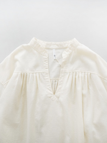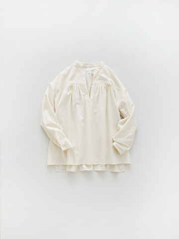 ほんのり裾が広がるラインと、胸元とバックに施したギャザーが特徴です。甘くなりすぎないよう、スキッパーカラーですっきりとした要素を加え、デイリーに取り入れやすいシャツに仕上がっています。