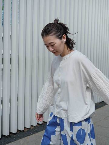 袖部分には、ほんのり透け感のある格子柄の別布を使用しています。個性はありつつ主張しすぎない柄なので、無地のアイテムとも柄物ともすんなり馴染みます。コーディネートにあれこれ悩まず、取り入れやすいアイテムです。
