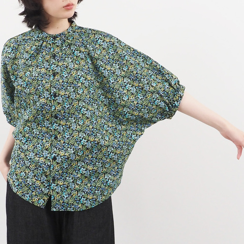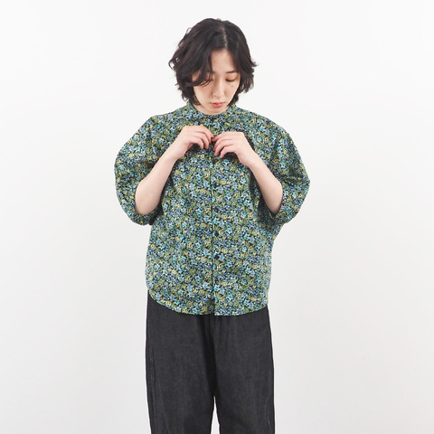 すっきりとしたスタンドカラーは、甘さのある小花柄との相性も抜群で、顔まわりを上品に引き立ててくれます。