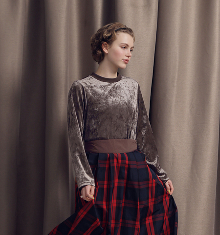 柔らかく落ち感のあるベロア生地にメッシュの透け感を加えた、秋のはじまりにぴったりな素材感。程よい透け感が女性らしさと抜け感を演出します。