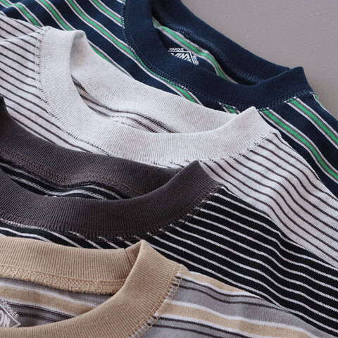 ゆとりを持たせた身幅と腰にかかるほどのややコンパクトな着丈でトレンドライクなシルエットに。リラックス感のある着心地ながらも首回りと袖口のリブが全体を引き締めて、すっきりとした印象でご着用いただけます。左胸のロゴワッペンがデザインのポイント。どこかレトロな雰囲気漂う配色のボーダー柄はさらっと纏うだけでこなれた着こなしが叶いますよ。