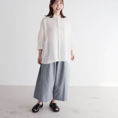 洗いざらしのような自然なシワ感と柔らかな風合いを生み出すマグワッシャー加工を施したオーガニックコットンを使用。ややハリのある生地はさらりと心地よく、肌離れが良いので蒸し暑い時期から秋口まで快適にご着用いただけます。落ち着いた配色のストライプ柄が洗練された大人の雰囲気を演出し、カジュアルな中にも気品を感じられる仕上がりになっています。