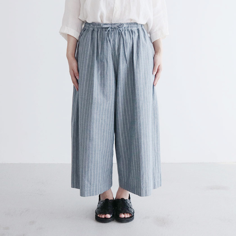 キュロットパンツのようなリラックス感のあるシルエット。歩くたびにふわりと風を通す涼やかな穿き心地が魅力です。足首が見えるクロップド丈は軽快な印象で、カラフルな靴下をちらりと覗かせたり、足元のコーディネートを楽しむのも素敵ですね。ウエストは嬉しい総ゴム仕様。ドローコードが付いているのでサイズ調節も可能です。