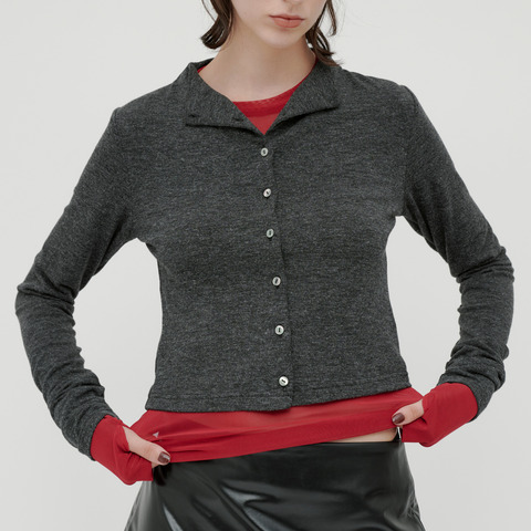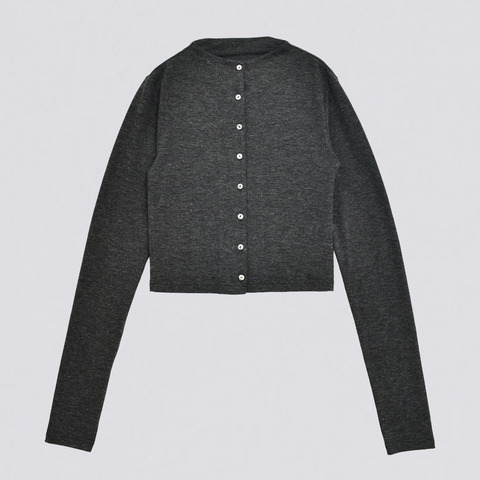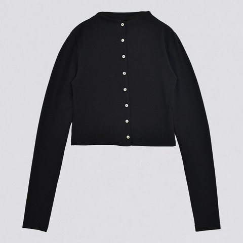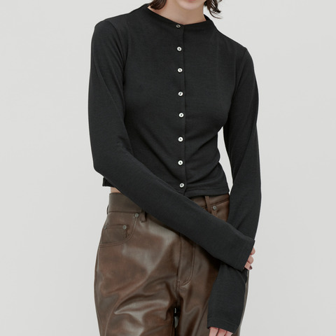 ニットのような風合いで滑らかな肌触りのスタンドネックカーディガン。