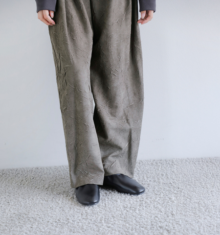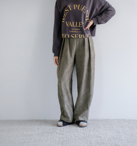 スウェードライクな風合いに、独特なシワ加工が施されたイージーパンツ。シンプルなタック入りワイドデザインながら、素材そのものにニュアンスがあるため、ベーシックなトップスと合わせるだけでもコーディネートに奥行きをもたらします。