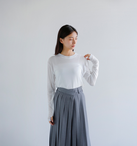 レイヤードしやすいように袖を長めに設計、動きやすいようにフィンガーホールもつけており、シーンを選ばず使えるベーシックな1枚。